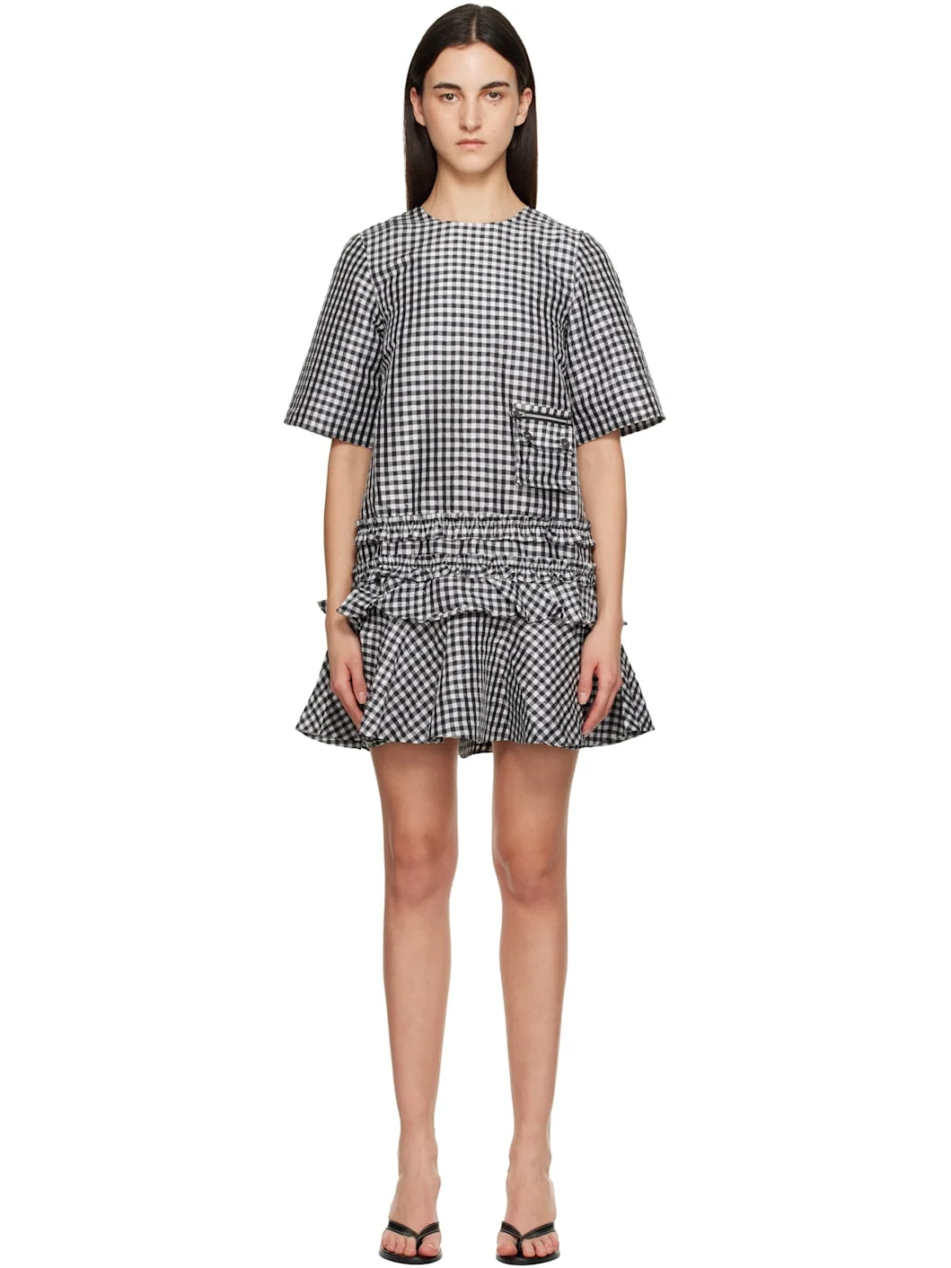 Recycled polyester cloque minidress. · Check pattern throughout · Crewneck · Detachable flap pocket at front · Ruffled trim at waist · Self-tie fastening at back collar · Zip closure at low back Supplier color: Black 100% recycled polyester. Made in Turkey 252144F052005