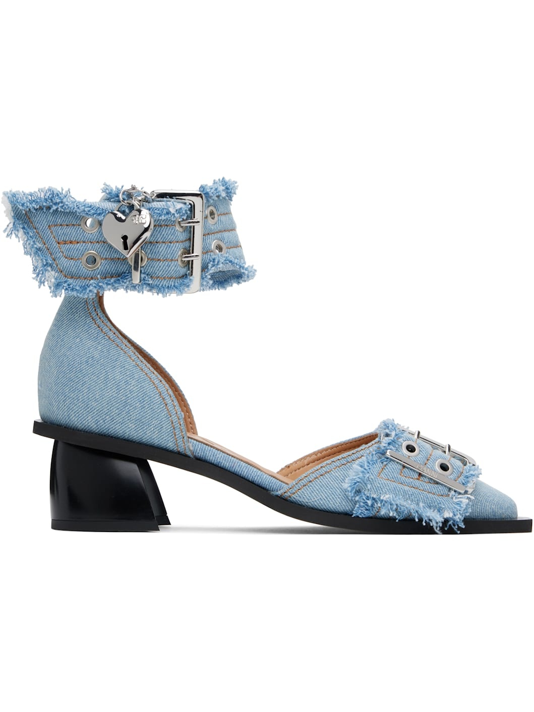 Recycled cotton denim heels in blue. · Frayed edges throughout · Pointed toe · Pin-buckle strap at vamp · Pin-buckle ankle strap · Buffed faux-leather lining · Covered block heel with rubber injection · Rubber sole · Contrast stitching in tan · Heel: H1.75" Supplier color: Faded denim Upper: textile. Sole: rubber. Made in Portugal 251144F122007