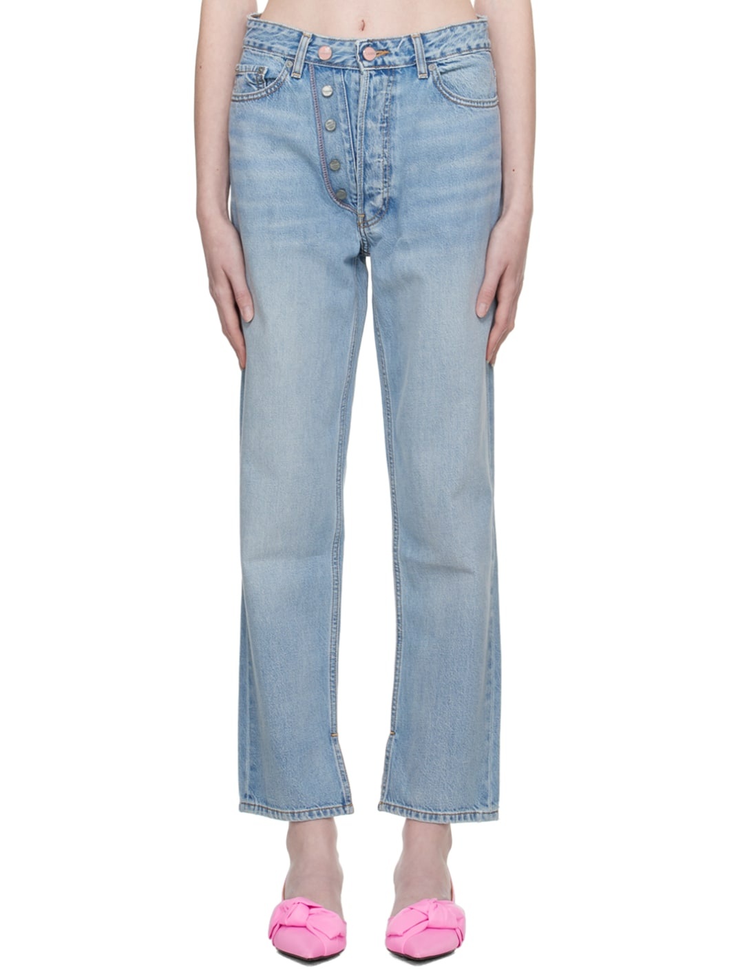 Relaxed-fit non-stretch organic cotton denim jeans. Fading and whiskering throughout. · Belt loops · Five-pocket styling · Double button-fly for alternate styling · Vented cuffs · Textile logo patch at back · Logo-engraved silver-tone hardware · Contrast stitching in tan Supplier color: Light blue vintage 100% organic cotton. Made in Turkey 231144F069012