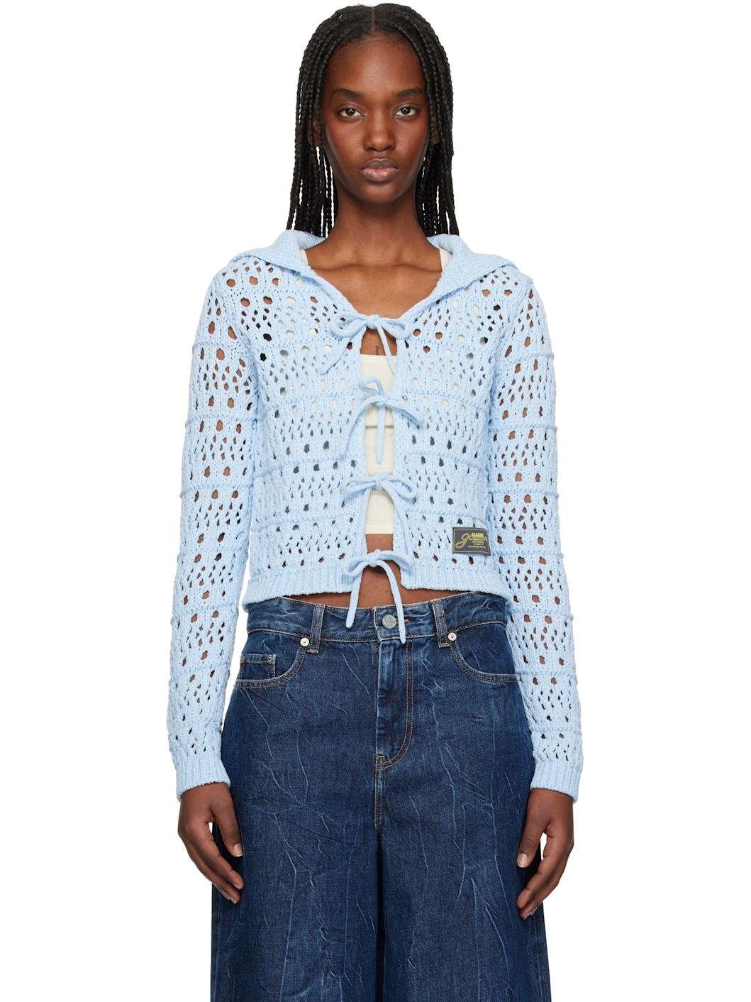 Open-knit recycled cotton- and recycled polyester-blend cardigan. · Rib-knit sailor collar, hem, and cuffs · Self-tie fastenings at open front · Logo patch at hem Supplier color: Soft chambray 50% recycled cotton, 50% recycled polyester. Made in Moldova 251144F095019