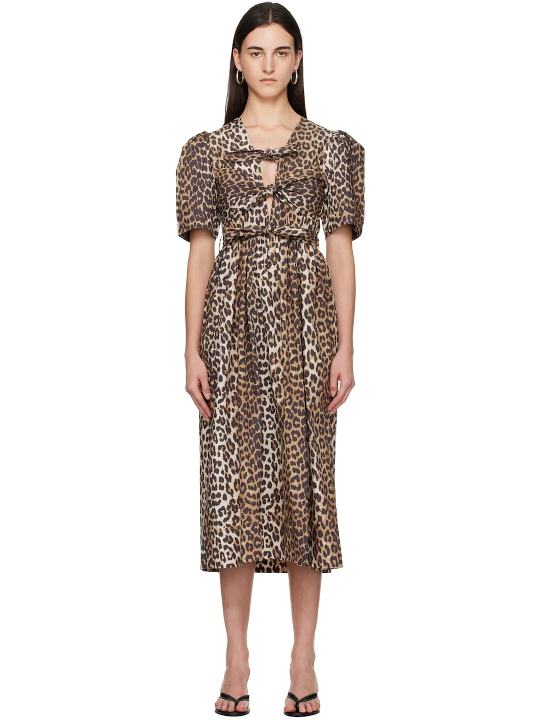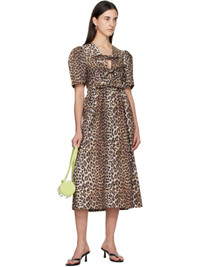 Organic cotton poplin midi dress. · Leopard pattern printed throughout · Self-tie bows at plunging V-neck · Gathering, belt loops, and detachable self-tie belt at waist · Puff sleeves Supplier color: Leopard 100% organic cotton. Made in India 252144F054001