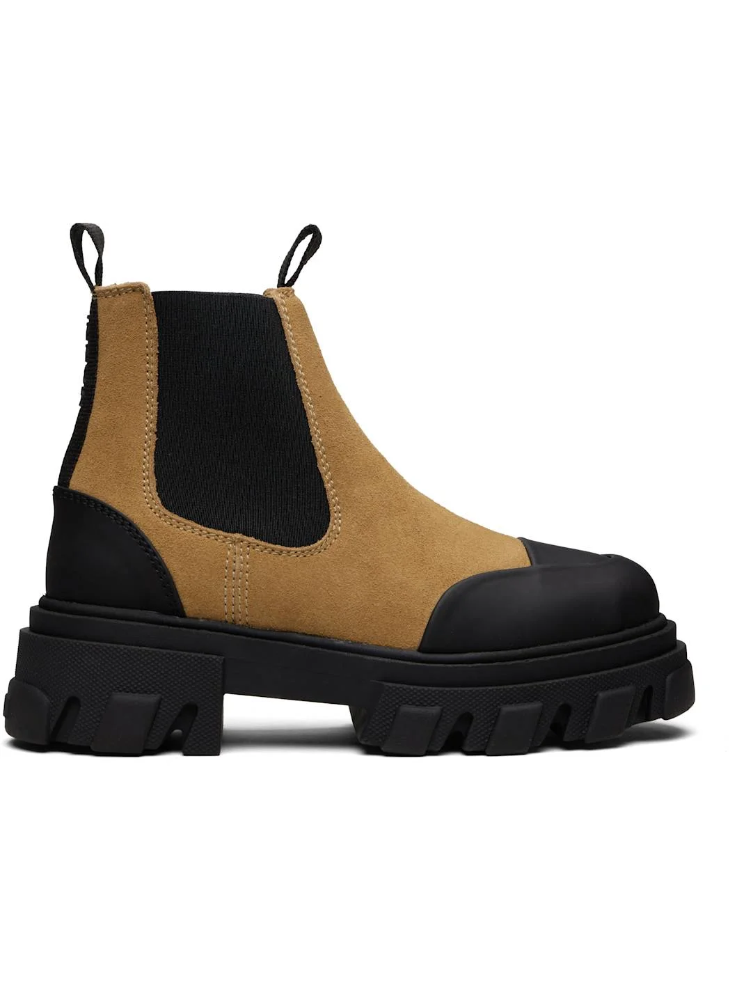 Ankle-high faux-suede Chelsea boots. · Rubber cap toe · Pull-loops at collar · Elasticized gusset at sides · Grained leather lining · Treaded rubber sole Supplier color: Cognac Upper: synthetic. Sole: rubber. Made in Portugal 252144F113008