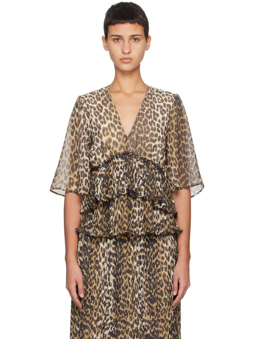 Recycled polyester georgette blouse. Ruffles, pleats, and leopard pattern printed throughout. · Tiered construction · Plunging V-neck · Full georgette lining Supplier color: Almond milk 100% recycled polyester. Made in India 241144F107006