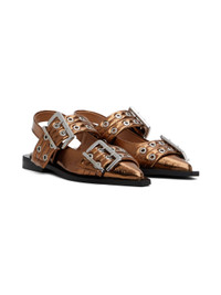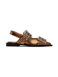 Crinkled faux-leather ballerina flats in metallic copper tone. · Pointed toe · Pin-buckle straps at vamp · Partially elasticized slingback strap · Logo embossed at padded footbed · Stacked rubber block heel · Rubber sole · Logo-engraved silver-tone hardware Supplier color: Bronze Upper: synthetic. Sole: rubber. Made in Portugal 242144F118015