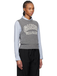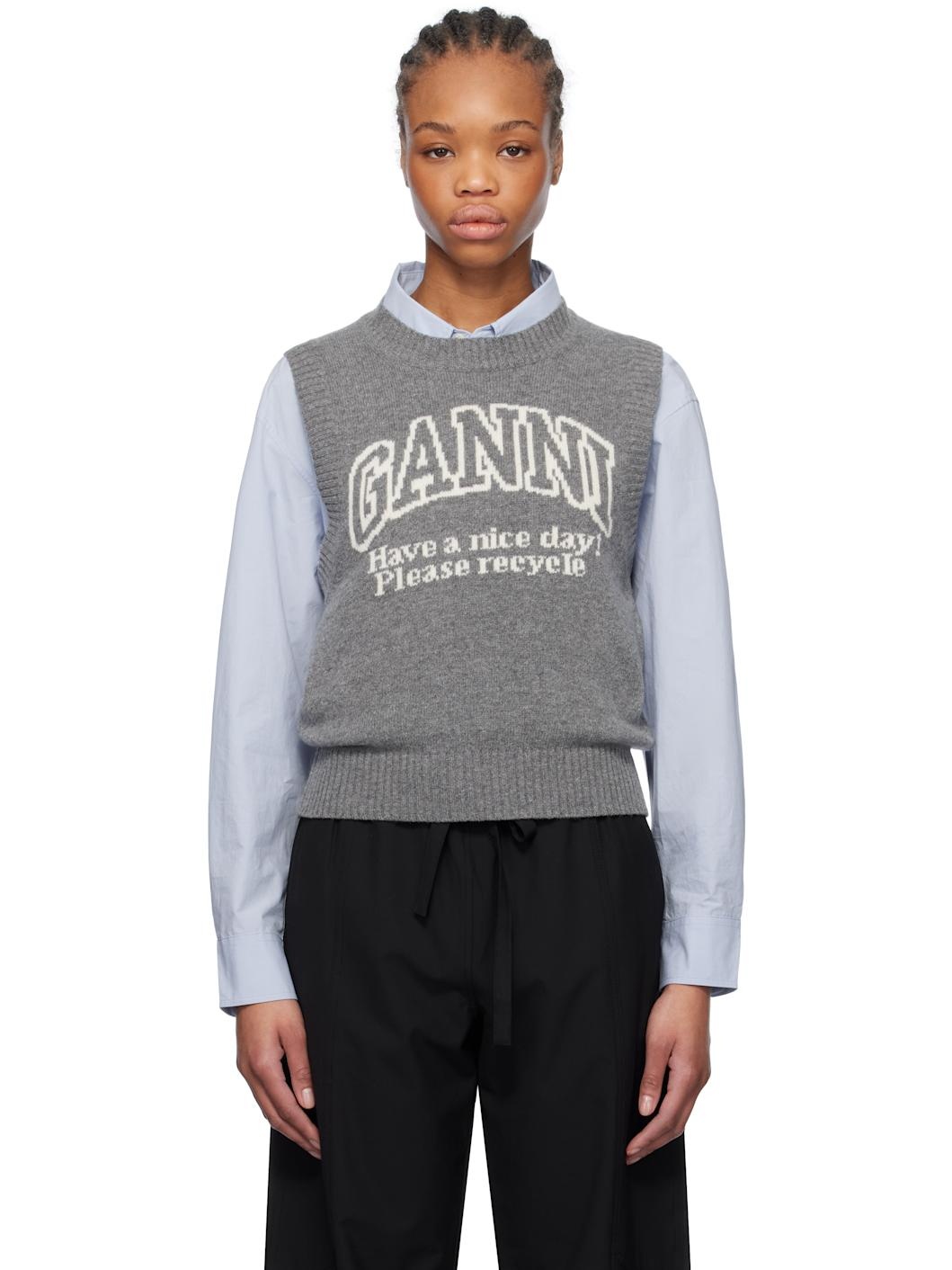 Knit recycled wool- and recycled nylon-blend vest. · Rib-knit crewneck, hem, and armscyes · Jacquard logo and text at front Supplier color: Frost gray 45% wool, 35% recycled wool, 20% recycled nylon. Made in Moldova 251144F096002