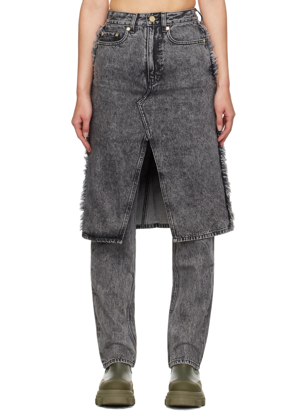 Straight-leg non-stretch organic cotton denim jeans. Fading throughout. · Layered construction · Belt loops · Five-pocket styling · Zip-fly · Slit at skirt-style overlay · Frayed detailing at outseams · Logo patch at back pocket · Logo-engraved gold-tone hardware Supplier color: Black washed 100% organic cotton. Made in Turkey 232144F069015
