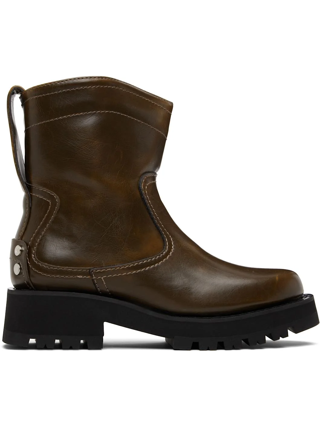 Ankle-high Oleatex™ grained faux-leather boots. · Pull-loop at collar · Rivets at heel counter · Rubber midsole and block heel · Treaded rubber sole Supplier color: Dark olive Synthetic. Made in Portugal 252144F113005