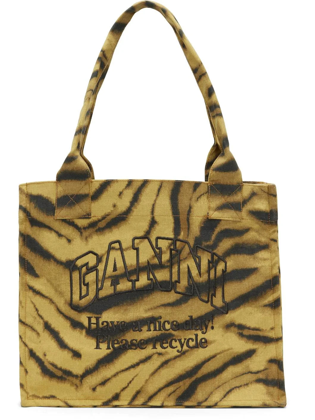 Recycled cotton canvas tote. · Stripes throughout · Padded shoulder straps · Logo and text embroidered at face · Zip pocket at interior · H11.5" x W14.5" x D6.5" Supplier color: Khaki Textile. Made in India 252144F049009
