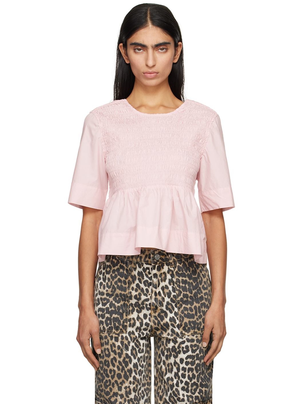 Organic cotton poplin blouse. Smocking and gathering throughout. · Round neck · Peplum hem · Open back Supplier color: Chalk pink 100% organic cotton. Made in India 242144F107020