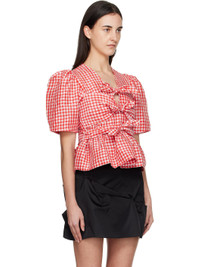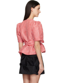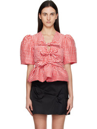 Crinkled taffeta blouse. · Check pattern throughout · Self-tie bows at plunging V-neck · Belt loops and detachable self-tie belt at waist · Peplum hem · Puff sleeves Supplier color: Red alert 100% recycled polyester. Made in India 252144F107006