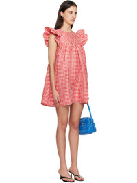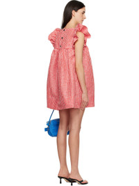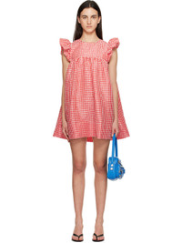 Recycled polyester cloque minidress. · Check pattern throughout · Crewneck · Gathering at bust · Ruffled cap sleeves · Button fastening at back collar Supplier color: Red alert 100% recycled polyester. Made in India 252144F052004