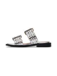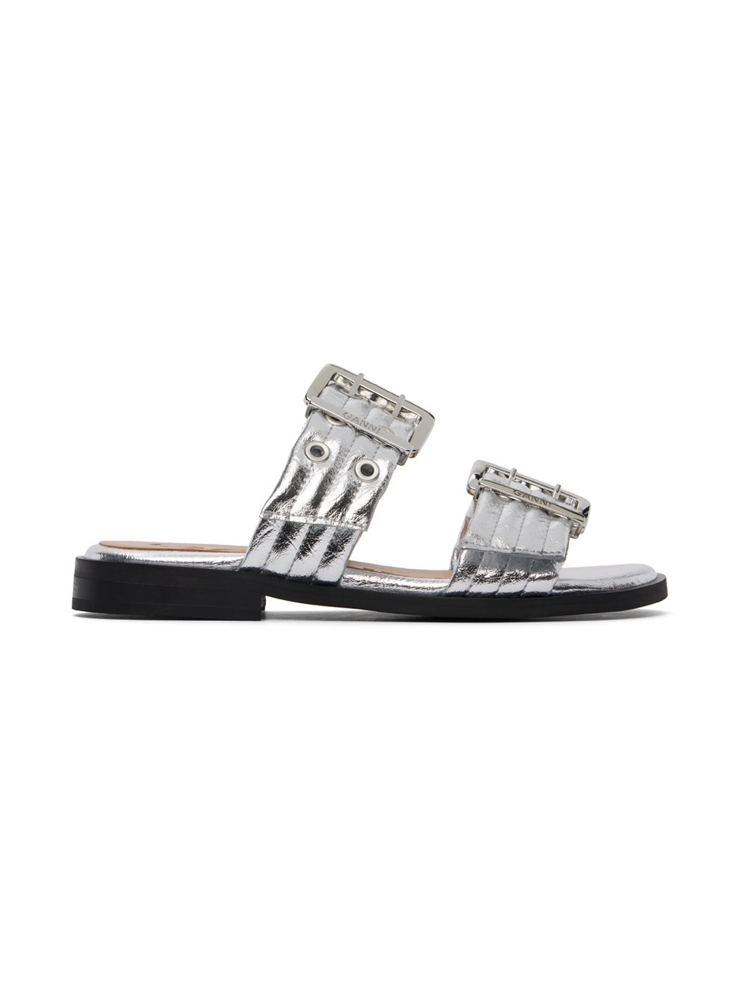 Crinkled faux-leather slip-on flat sandals in metallic silver tone. · Open toe · Pin-buckle straps at vamp · Logo embossed at padded footbed · Stacked rubber block heel · Faux-leather sole Supplier color: Silver Upper: synthetic. Sole: synthetic, rubber. Made in Portugal 242144F124003