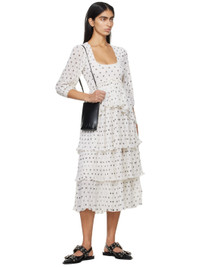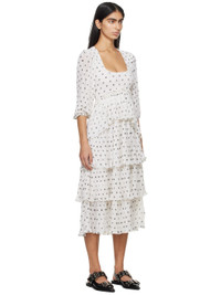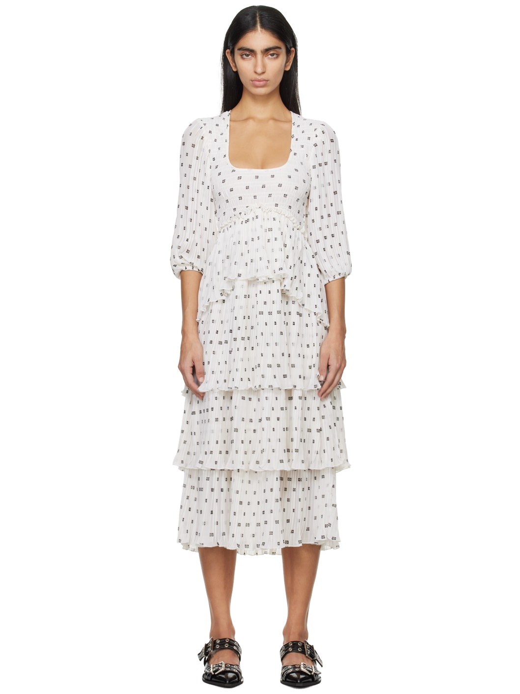 Recycled polyester georgette dress. Printed graphic pattern, pleats, and ruffled edges throughout. · Tiered layered construction · Scoop neck · Smocking at chest and back · Elasticized cuffs Supplier color: Egret 100% recycled polyester. Made in India 241144F054000