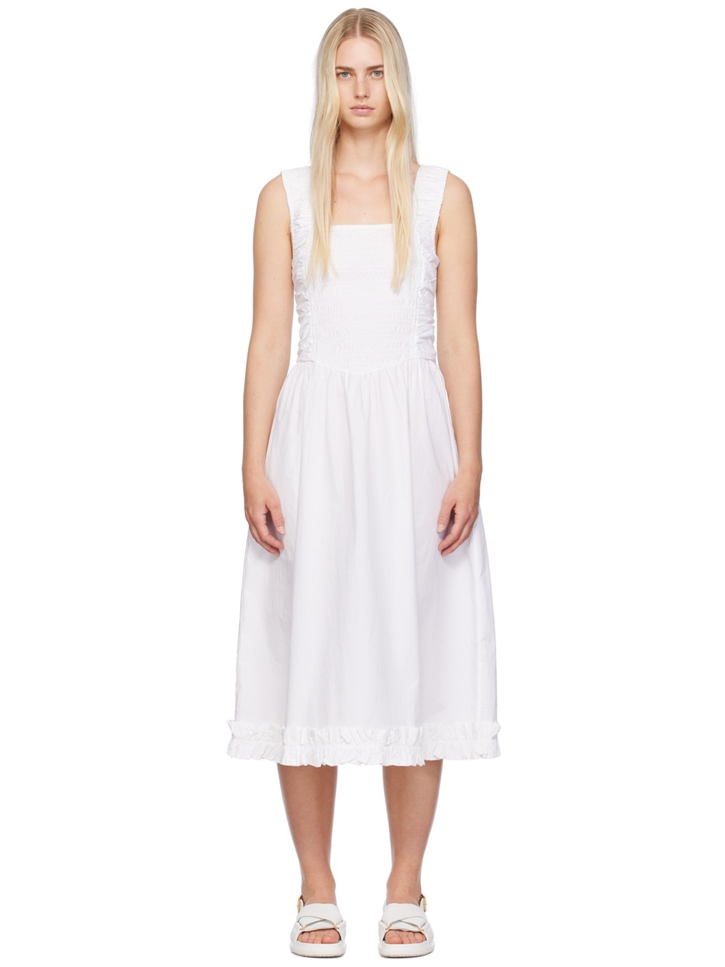 Organic cotton poplin dress. Gathering throughout. · Square neck · Shirring at front · Ruffled trim at hem · Elasticized shoulder straps · Elasticized straps and cutouts at back · Unlined Supplier color: Bright white 100% organic cotton. Made in India 242144F054005