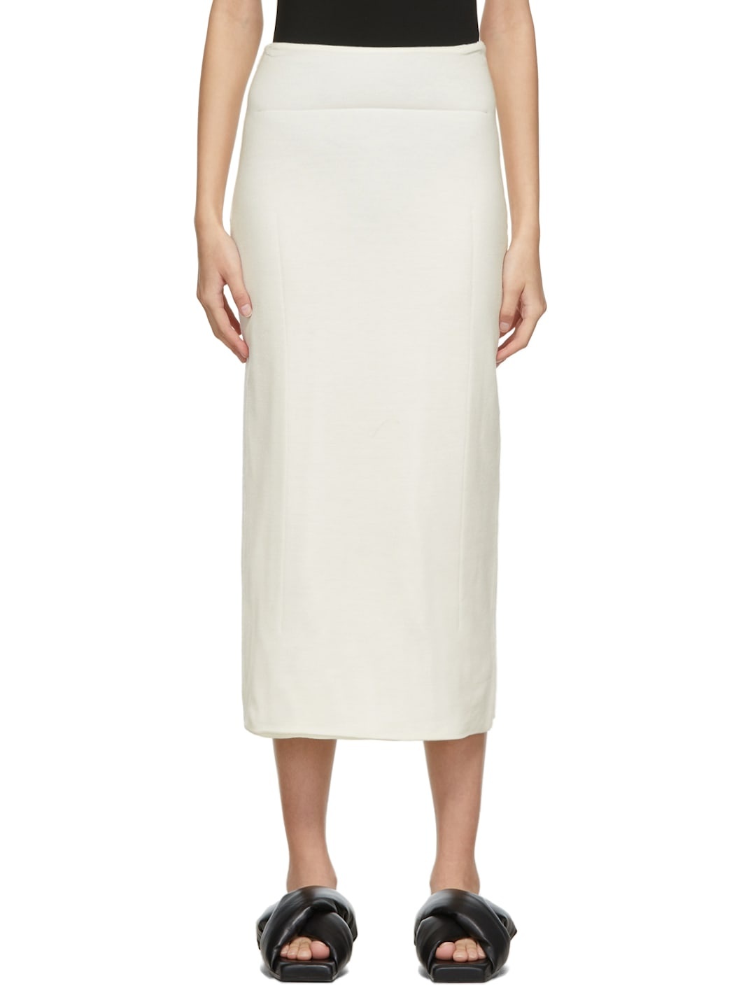 Paneled insulated wool jersey and rib knit wool mid-length skirt in off-white. · Mid-rise · Elasticized waistband · Vent at front hem Supplier color: Off-white/White Body: 100% wool. Fill: 100% polyester. Made in Italy 221808F092064