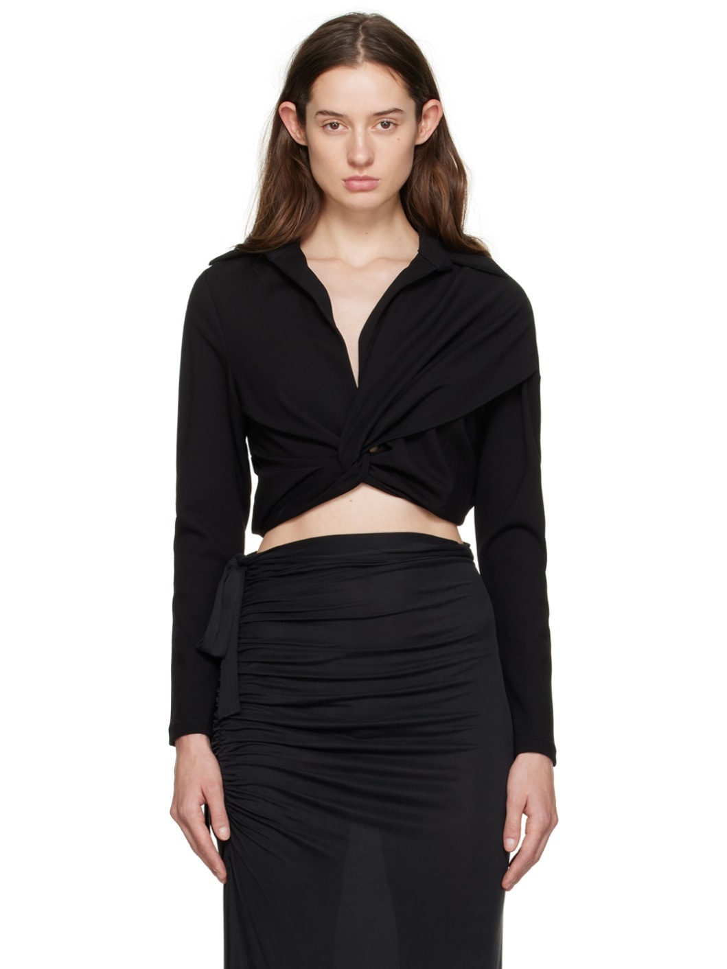Stretch viscose- and nylon-blend jersey blouse. · Spread collar · Plunging neck · Twisted accent at front Supplier color: Black 67% viscose, 28% polyamide, 5% elastane. Made in Macedonia 241329F107001