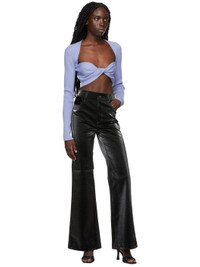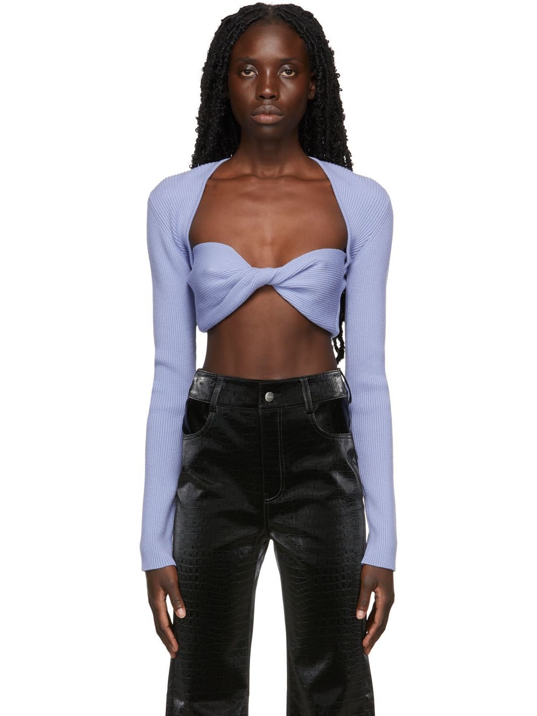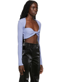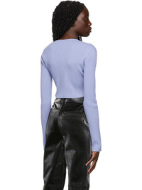 Long sleeve rib knit extrafine merino wool-blend sweater in blue. · Sweetheart neckline · Twisted construction at front · Cropped hem Supplier color: Cornflower blue 87% extrafine merino wool, 13% polyester. Made in Turkey 221329F100011