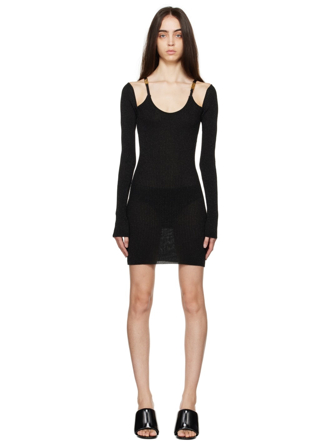Rib knit viscose-blend lurex dress. · Scoop neck · Shoulder straps with logo hardware · Low back Supplier color: Black 70% viscose, 15% nylon, 15% metal. Made in Italy 222308F052002
