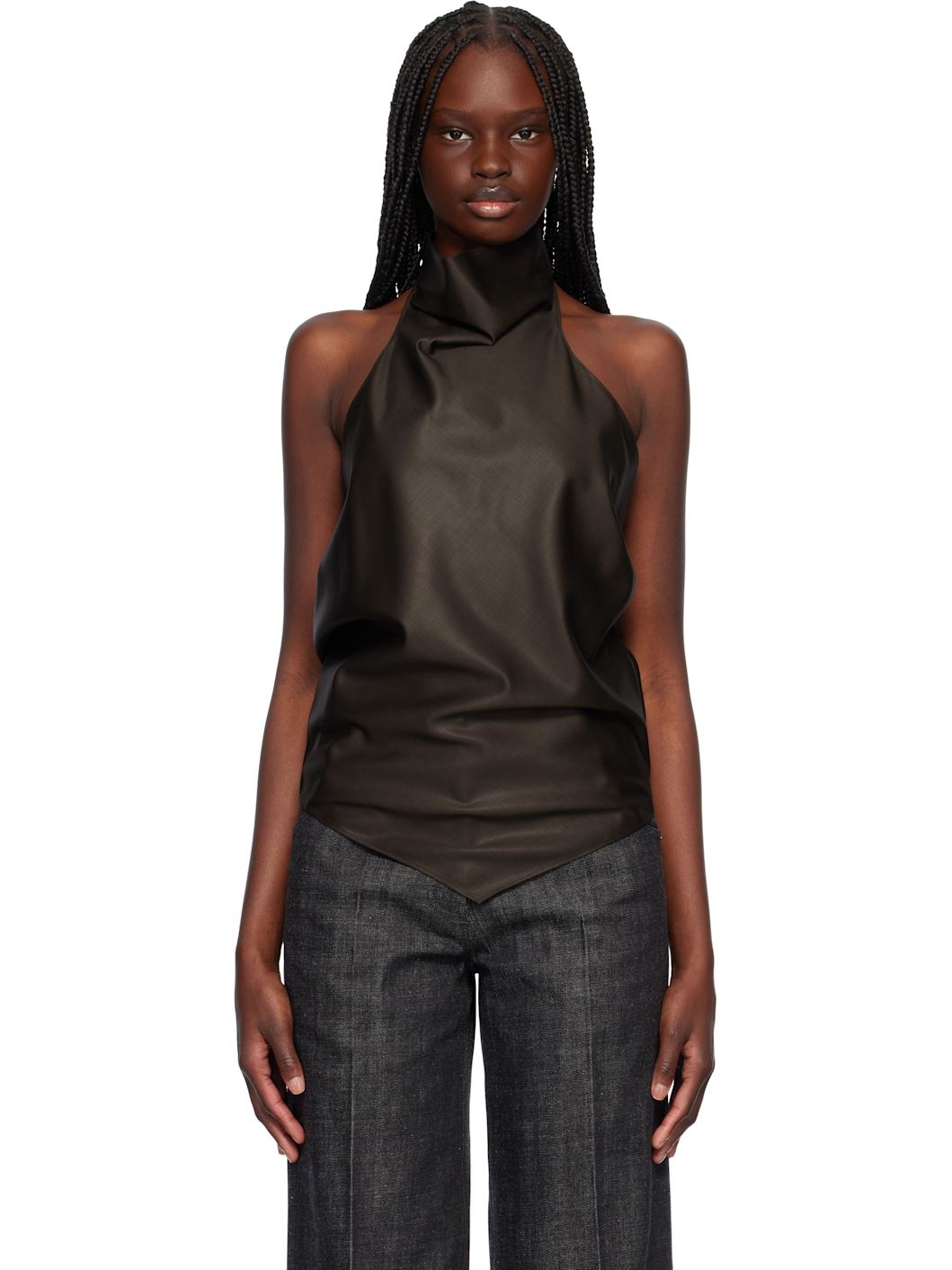 Wool broadcloth blouse. · High cowl neck · Pointed hem · Hook-eye fastening at back collar · Draping at low back · Unlined Supplier color: Brown 100% wool. Made in Viet Nam 251749F099000