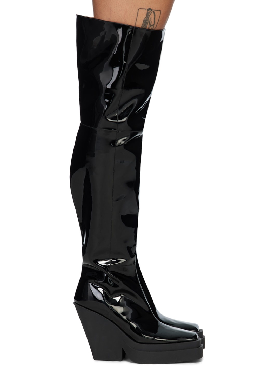 Knee-high patent leather boots in black. · Square toe · Zip closure at inner sides · Buffed leather lining in beige · Rubber wedge heel · Treaded rubber platform sole · Platform: H1.5 in · Heel: H5 in Supplier color: Black Upper: leather. Sole: rubber. Made in Italy 231671F115001