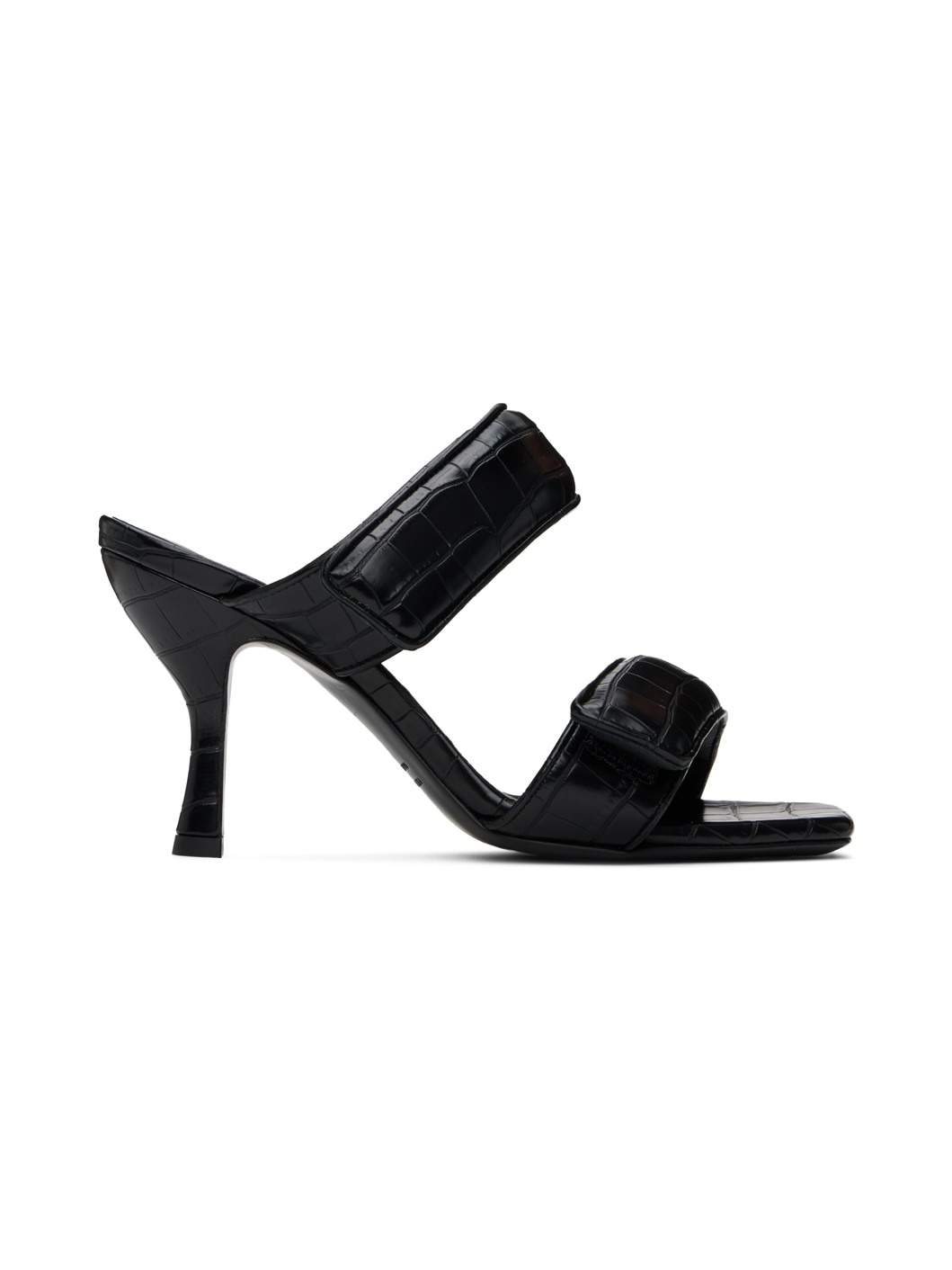 Croc-embossed faux-leather slip-on heeled sandals in black. · Open square toe · Padded velcro straps at vamp · Logo embossed at footbed · Covered stiletto heel with rubber injection · Leather sole · Heel: H3.75" Supplier color: Black Upper: synthetic. Sole: leather. Made in Italy 241671F125007