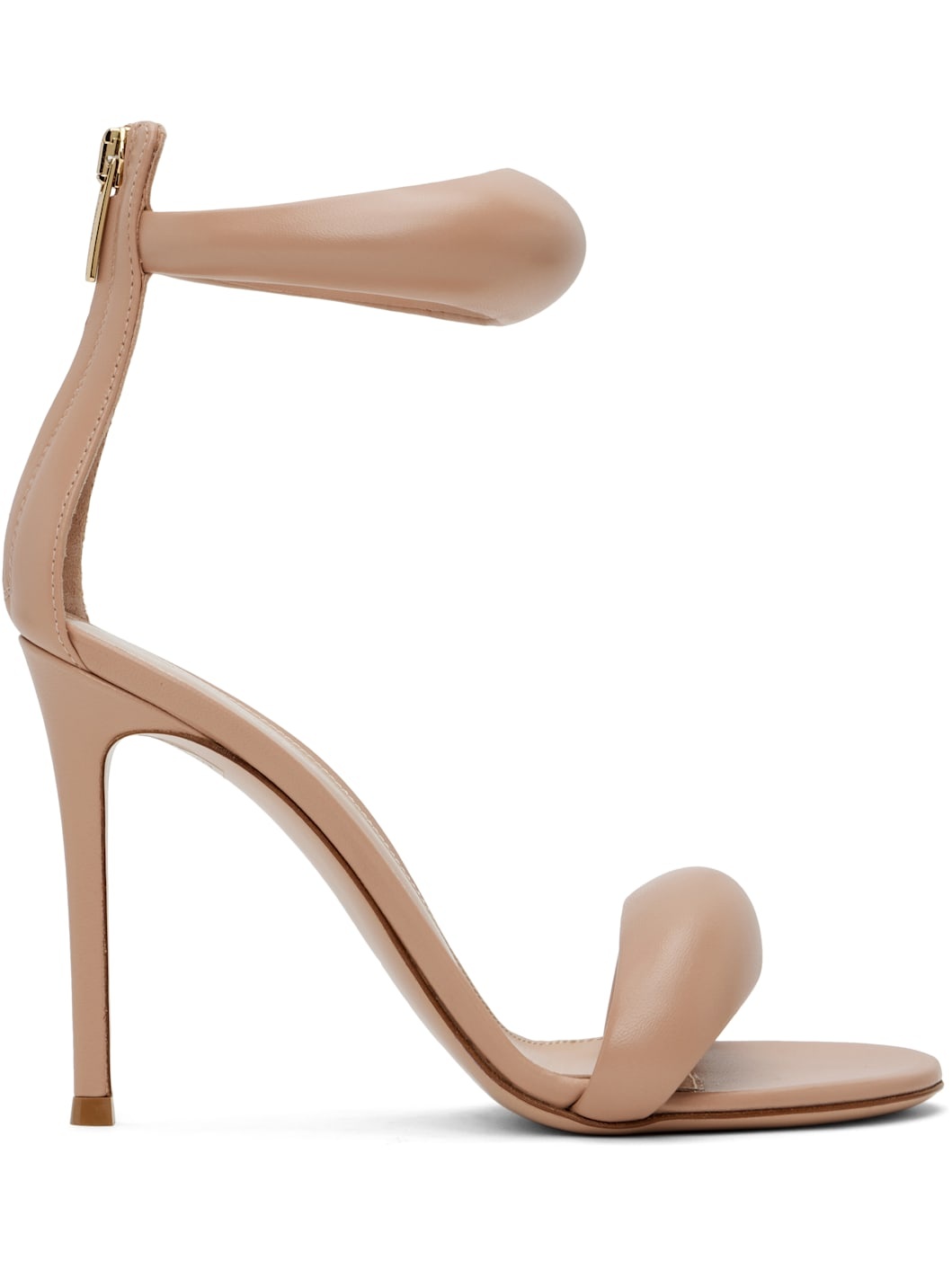 Grained nappa leather heeled sandals in beige. · Open toe · Padded strap at vamp · Padded ankle strap · Zip closure at heel · Logo stamp at padded footbed · Covered stiletto heel with rubber injection · Leather sole · Heel: H4" Supplier color: Peach Upper: leather. Sole: leather, rubber. Made in Italy 251090F125028