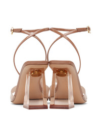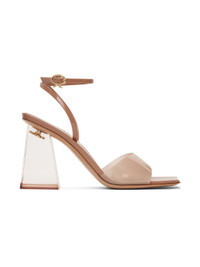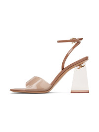 Transparent TPU heeled sandals in beige. · Open square toe · Adjustable pin-buckle ankle strap · Logo stamp at padded leather footbed · Sculptural transparent plexiglass block heel · Rubber injection at block heel · Leather sole · Heel: H3.5" Supplier color: Praline/Praline Upper: leather, thermoplastic polyurethane. Sole: leather, thermoplastic polyurethane. Made in Italy 241090F125012