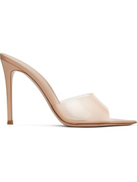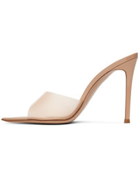 Handcrafted patent leather mules in beige. · Open pointed toe · Semi-transparent vinyl strap at vamp · Logo stamp at padded leather footbed · Covered stiletto heel with rubber injection · Leather sole · Heel: H4" Supplier color: Beige Upper: leather, thermoplastic polyurethane. Sole: leather, rubber. Made in Italy 251090F125007