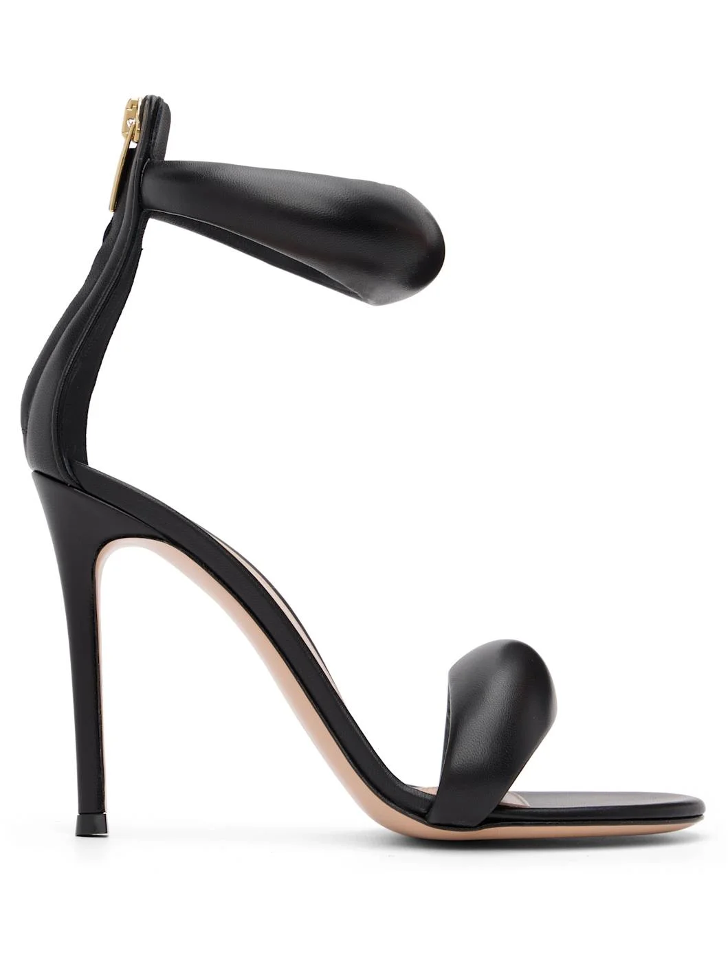 Buffed nappa lambskin heeled sandals. · Open toe · Padded strap at vamp and ankle · Zip closure at heel · Covered stiletto heel · Calfskin sole · Heel: H4" Supplier color: Black nappa Upper: lambskin. Sole: calfskin. Made in Italy 261090F125038