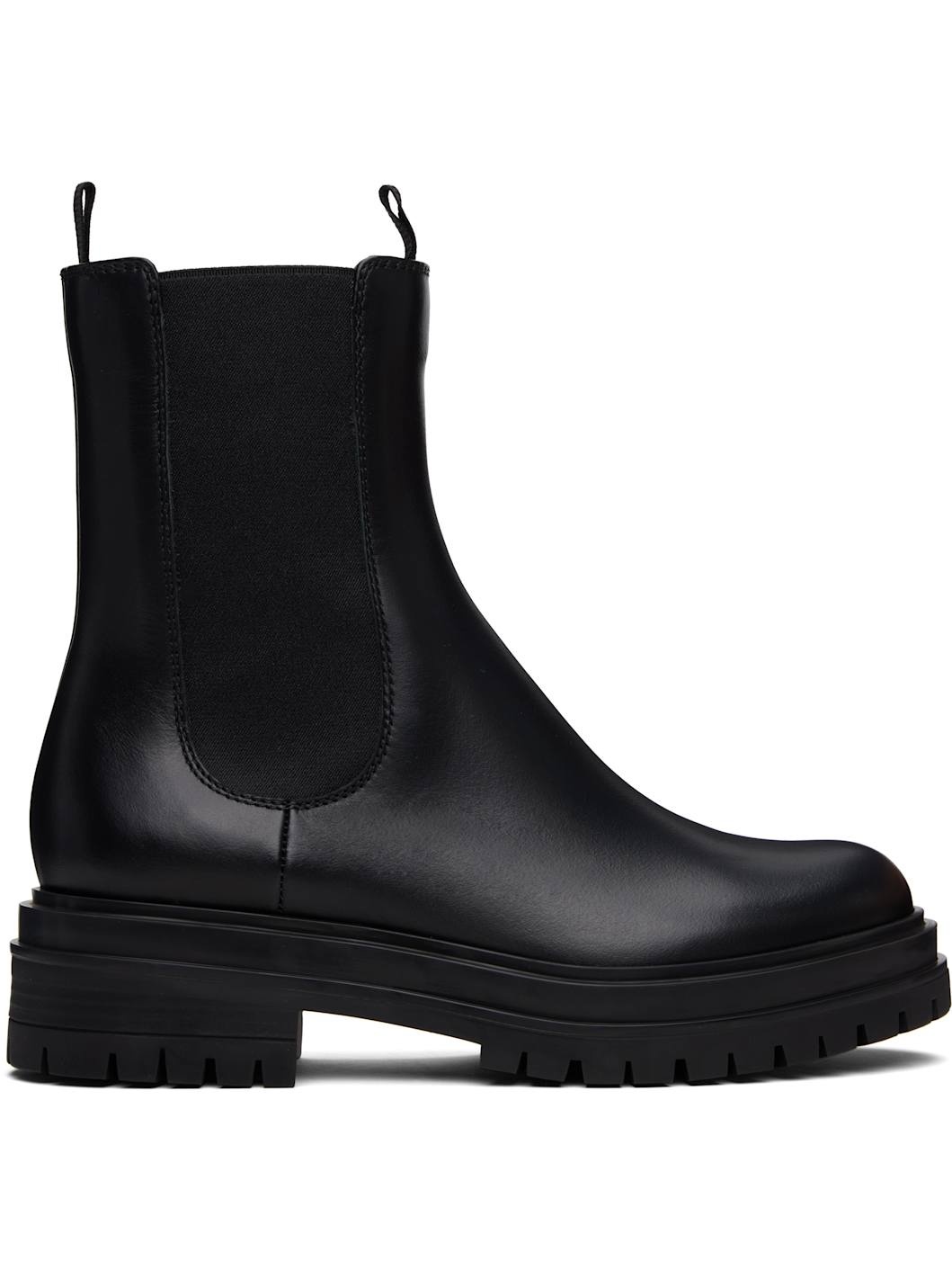 Handcrafted ankle-high buffed calfskin Chelsea boots in black. · Grosgrain pull-loops at collar · Elasticized gusset at sides · Grained leather lining · Treaded rubber sole Supplier color: Black Upper: leather. Sole: rubber. Made in Italy 252090F113007