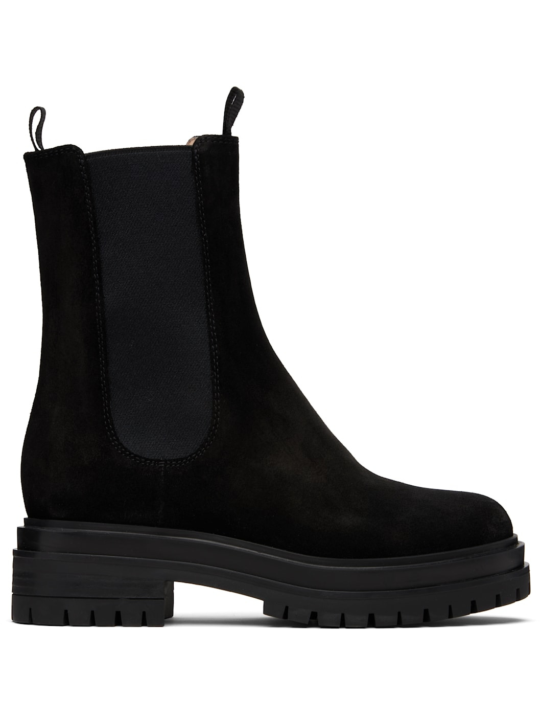 Handcrafted ankle-high suede Chelsea boots. · Pull-loops at collar · Elasticized gusset at sides · Buffed leather lining · Treaded rubber sole Supplier color: Black Upper: leather. Sole: rubber. Made in Italy 252090F113006