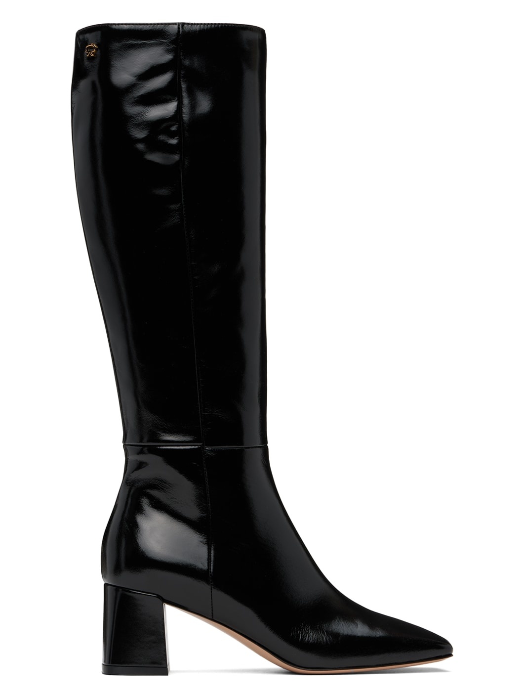 Handcrafted mid-calf patent nappa calfskin boots in black. · Square toe · Zip closure at inner side · Logo hardware at outer side · Covered block heel with rubber injection · Leather sole · Heel: H2.5" Supplier color: Nuit black Upper: calfskin. Sole: leather, rubber. Made in Italy 242090F115000