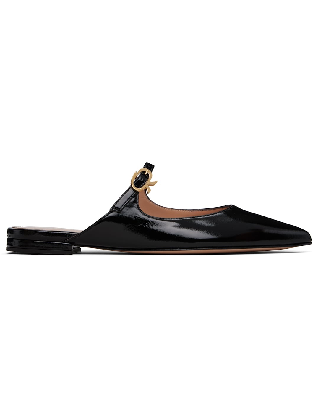 Polished leather Mary Jane-style slip-on loafers in black. · Pointed toe · Logo hardware at pin-buckle strap · Logo stamp at padded leather footbed · Covered block heel with rubber injection · Polished leather sole Supplier color: Black Leather. Made in Italy 252090F118004