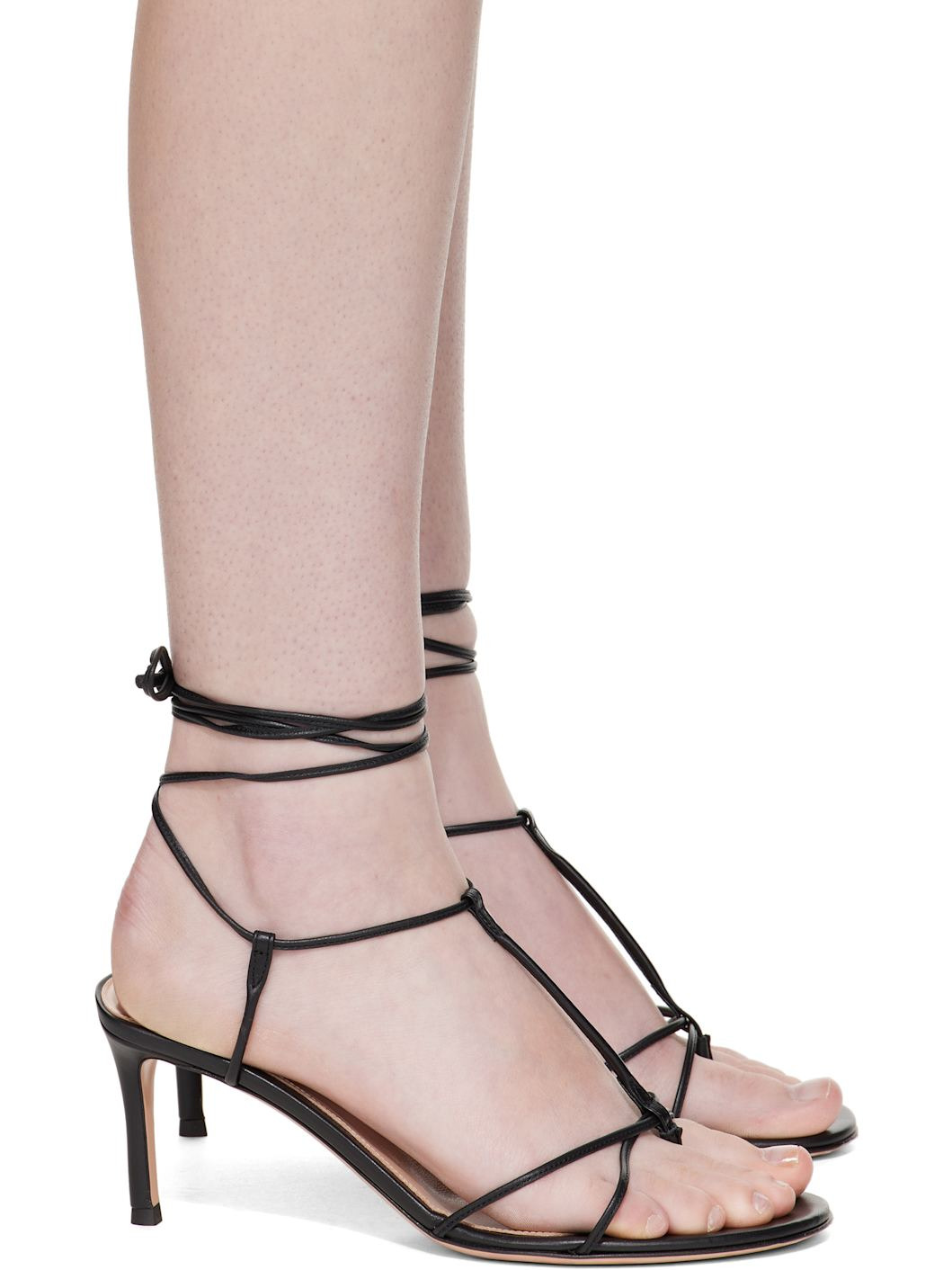 Buffed nappa lambskin heeled sandals. · Thong-style strap at open toe · Straps at vamp · Wraparound self-tie ankle strap · Covered stiletto heel with rubber injection · Leather sole · Heel: H3.25" Supplier color: Black Upper: lambskin. Sole: leather, rubber. Made in Italy 252090F125014