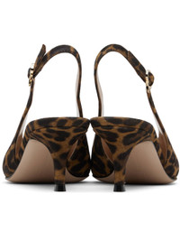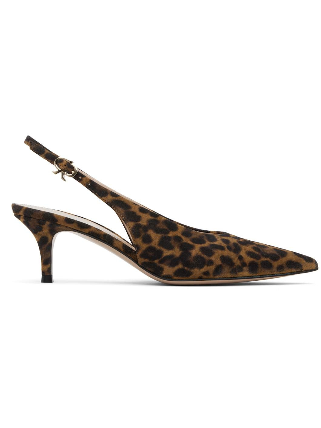 Handcrafted suede heels. · Leopard pattern printed throughout · Pointed toe · Pin-buckle slingback strap · Buffed leather lining · Covered stiletto heel with rubber injection · Leather sole · Heel: H2.25" Supplier color: Leopard Upper: leather. Sole: leather, rubber. Made in Italy 252090F122019