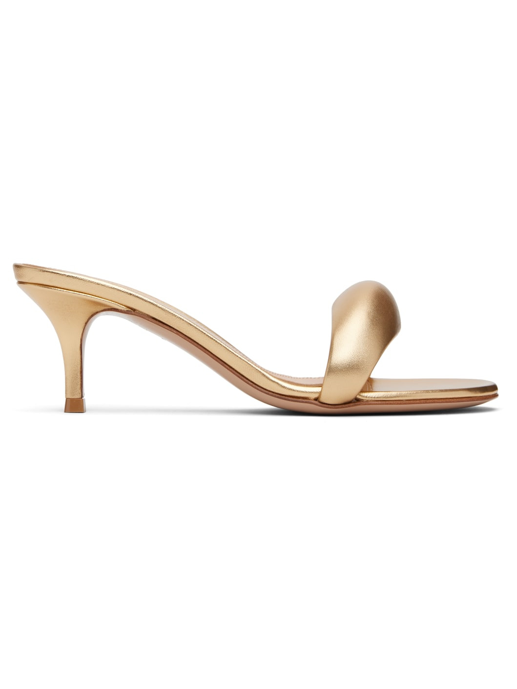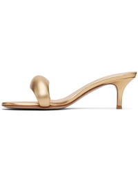 Handcrafted buffed leather slip-on heeled sandals. · Open toe · Padded strap at vamp · Logo stamp at padded footbed · Covered stiletto heel with rubber injection · Leather sole · Heel: H2" Supplier color: Mekong Upper: leather. Sole: leather, rubber. Made in Italy 252090F125022