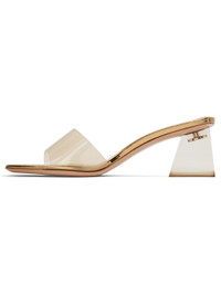 Handcrafted transparent vinyl and patent faux-leather mules in metallic gold tone. · Open square toe · Logo stamp at buffed leather footbed · Sculptural transparent plexiglass block heel · Leather sole · Heel: H2" Supplier color: Mekong/Mekong Upper: synthetic, thermoplastic polyurethane. Sole: leather. Made in Italy 251090F125019