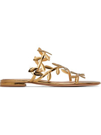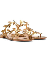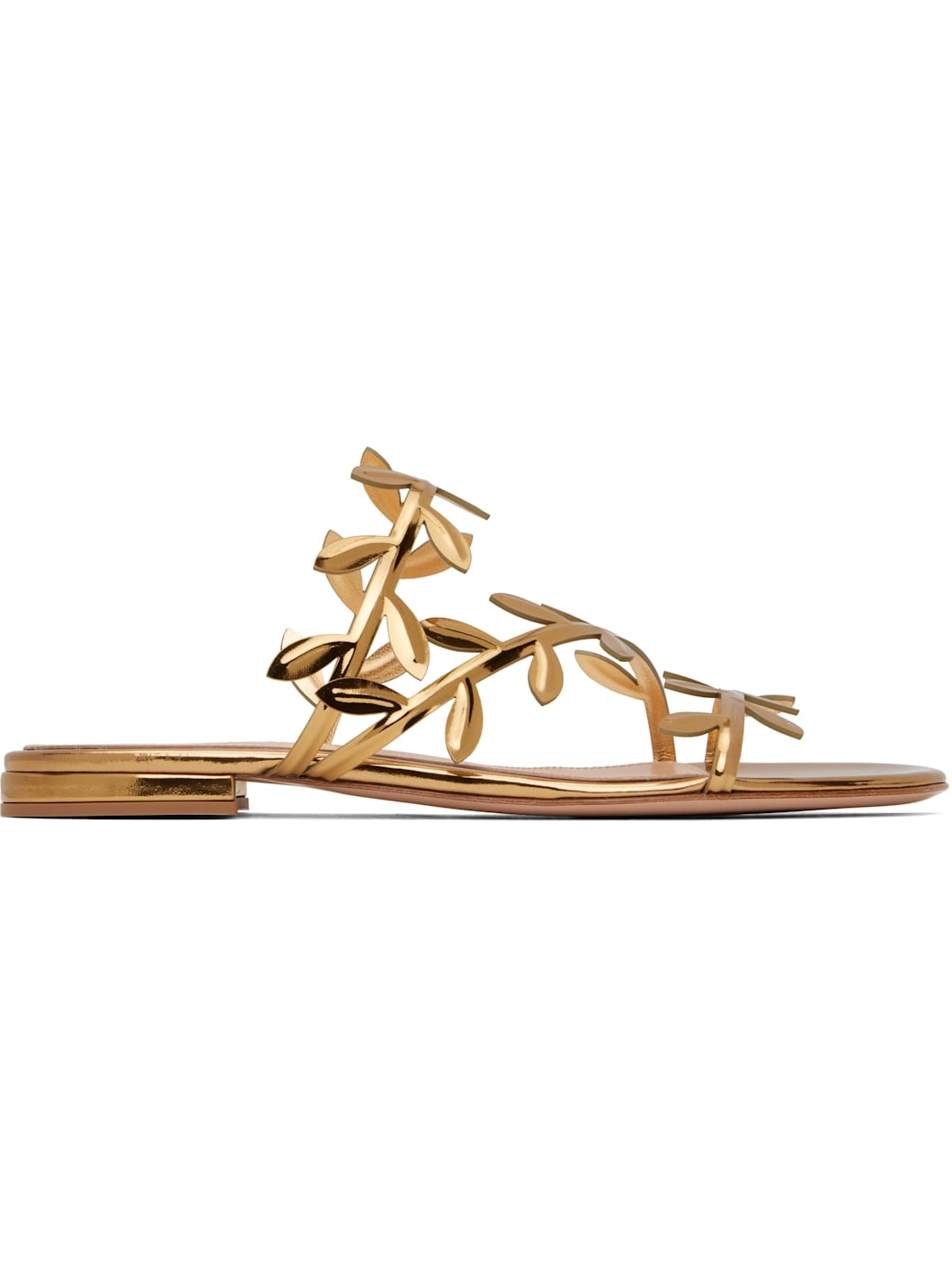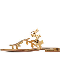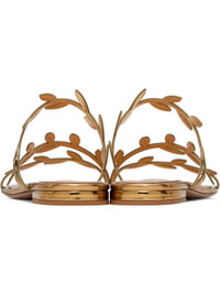 Handcrafted patent nappa calfskin flat sandals in gold tone. · Open toe · Laser-cut graphic straps at vamp · Logo stamp at padded leather footbed · Covered block heel · Leather sole with rubber injection Supplier color: Gold Upper: calfskin. Sole: leather, rubber. Made in Italy 251090F124005