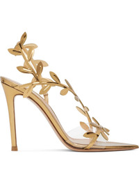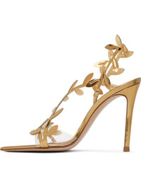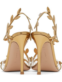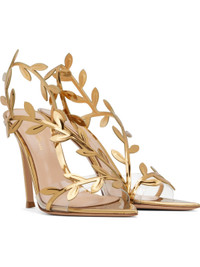 Handcrafted patent calfskin heeled sandals in gold tone. · Laser-cut graphics throughout · Open pointed toe · Transparent vinyl strap at vamp · Slingback strap · Logo stamp at padded leather footbed · Covered stiletto heel with rubber injection · Leather sole · Heel: H4" Supplier color: Gold