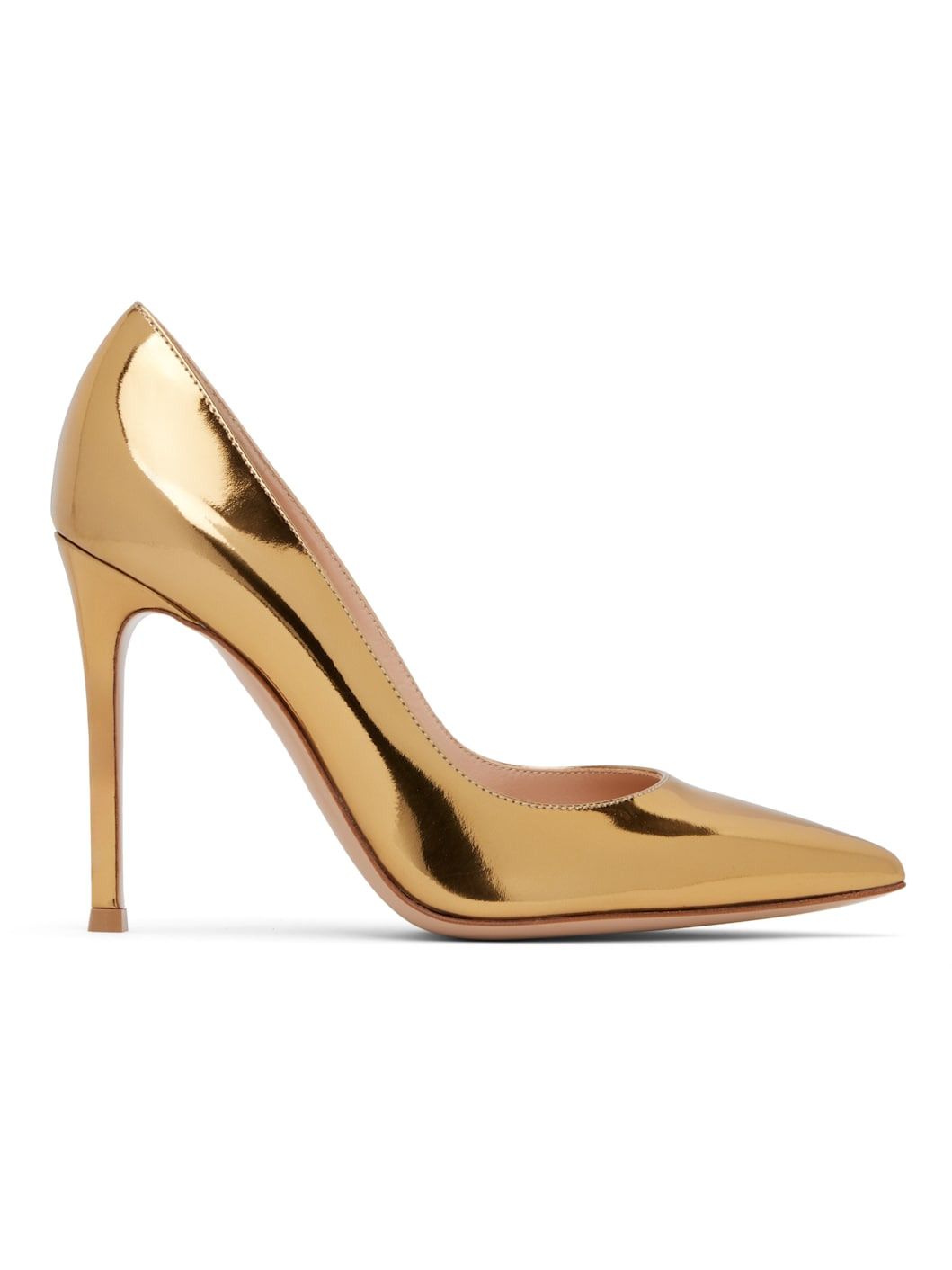 Handcrafted patent nappa leather heels. · Pointed toe · Covered stiletto heel with rubber injection · Leather sole · Heel: H4" Supplier color: Gold Upper: leather. Sole: leather, rubber. Made in Italy 252090F122012