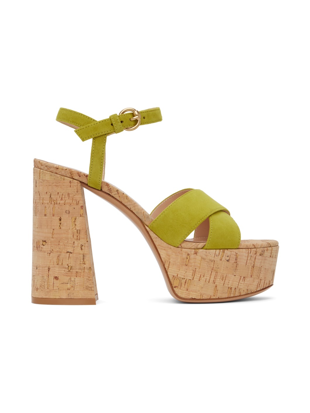 Suede heeled sandals in green. · Open toe · Criss-crossing straps at vamp · Pin-buckle ankle strap · Logo embossed at padded leather footbed · Cork block heel with rubber injection · Cork platform midsole · Leather sole · Platform: H1.75" · Heel: H4.5" Supplier color: Pistachio/Cork Upper: leather. Sole: cork, leather, rubber. Made in Italy 241090F125035