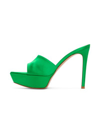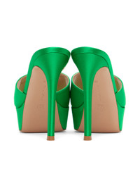 Satin slip-on heeled sandals in green. · Open pointed toe · Strap at vamp · Covered platform midsole and stiletto heel with rubber injection · Leather sole · Platform: H1.25 in · Heel: H4.5 in Supplier color: Green Upper: textile. Sole: leather. Made in Italy 231090F125070