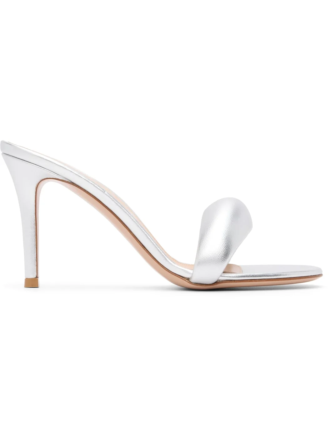 Buffed nappa lambskin heeled sandals. · Open toe · Padded strap at vamp · Covered stiletto heel · Calfskin sole · Heel: H3.25" Supplier color: Silver metallic nappa Upper: lambskin. Sole: calfskin. Made in Italy 261090F125028