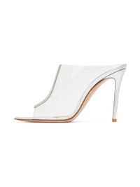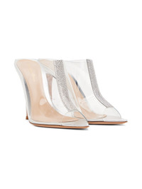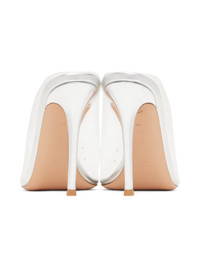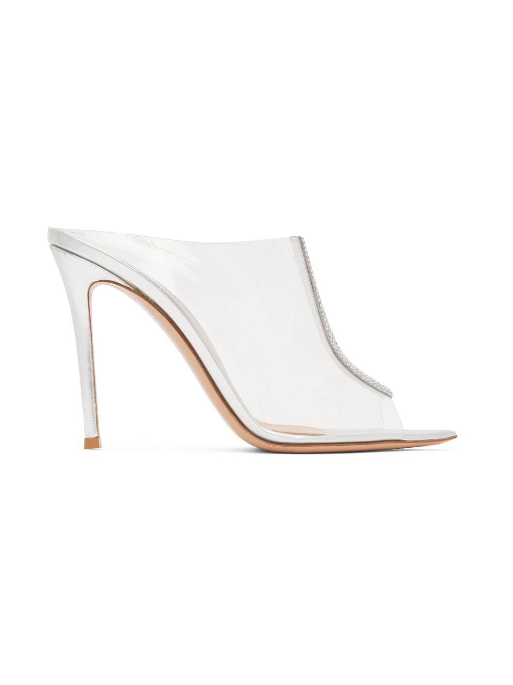 Handcrafted transparent vinyl and nappa leather heeled sandals in metallic silver-tone. · Open pointed toe · Suede cut-out with crystal-cut detailing at vamp · Covered stiletto heel with rubber injection · Leather sole · Heel: H4 in Supplier color: Transparent/Silver/Silver Upper: polyvinyl chloride, leather. Sole: leather. Made in Italy 222090F125017