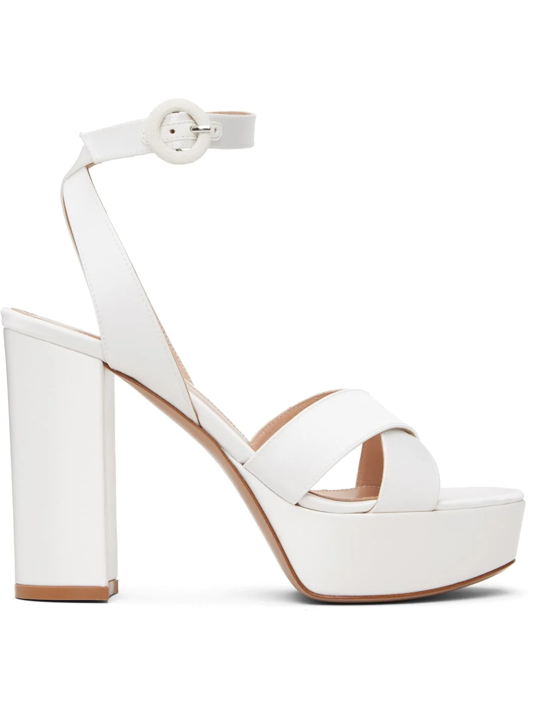 Handcrafted satin heeled sandals. · Open toe · Crisscrossing straps at vamp · Pin-buckle ankle strap · Logo printed at footbed · Covered platform midsole and block heel · Polished leather sole · Platform: H1.25" · Heel: H4.25" Supplier color: White Upper: textile, leather. Sole: leather. Made in Italy 261090F125003