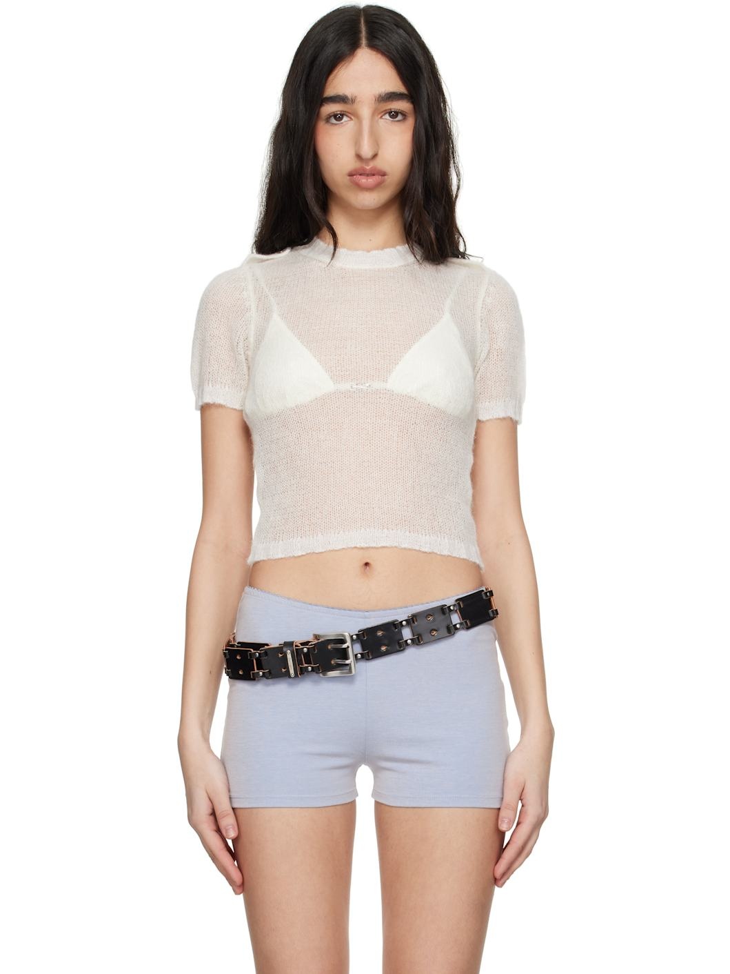 Open-knit nylon- and alpaca-blend T-shirt. · Semi-sheer · Rib-knit crewneck, hem, and cuffs · Epaulets Supplier color: White 48% nylon, 26% alpaca, 26% mohair. Made in Spain 251776F110011