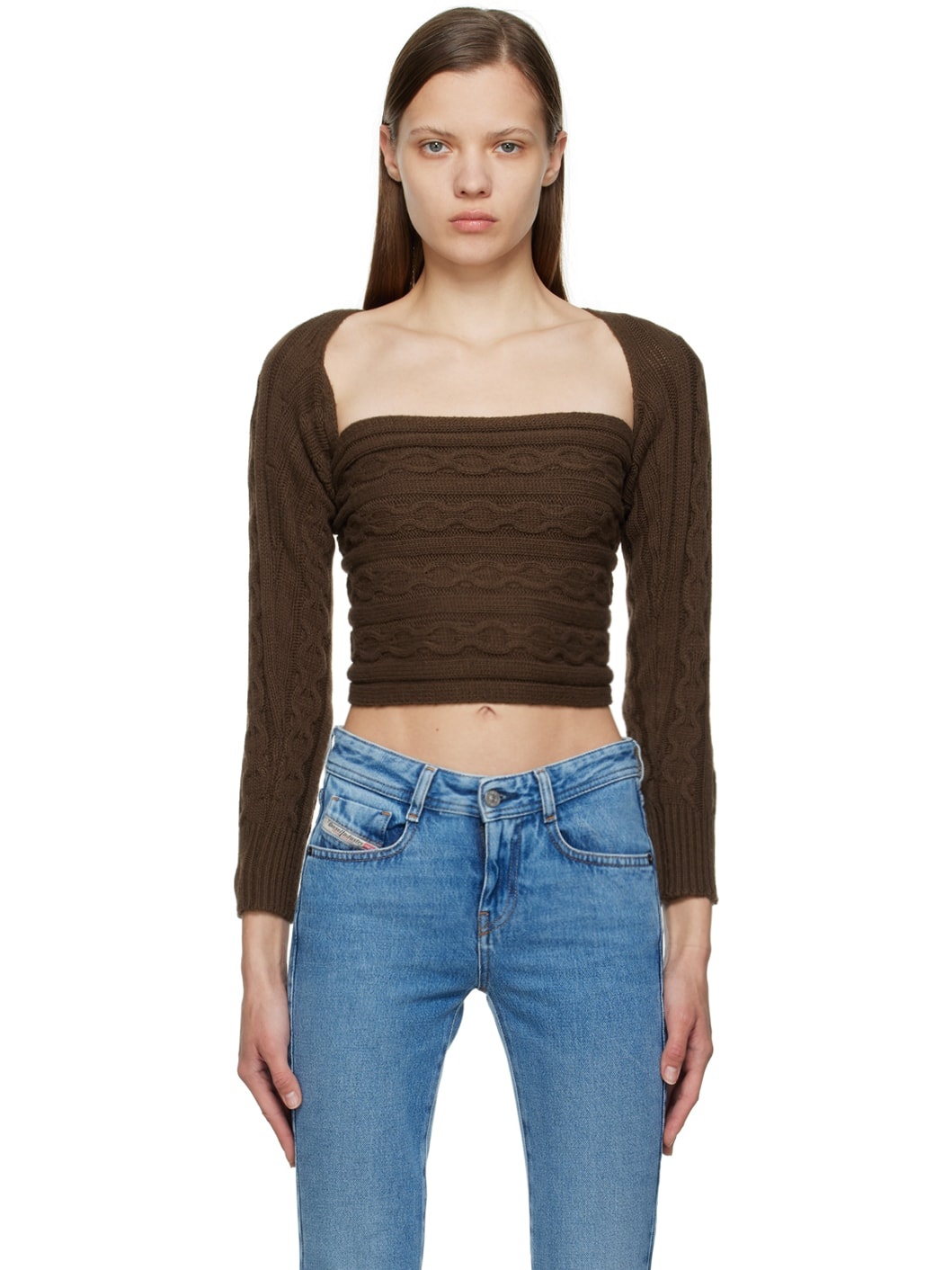 Cable knit nylon and wool-blend sweater. · Wrap construction · Square neck · Rib knit cuffs Available exclusively at SSENSE. Supplier color: Brown