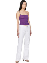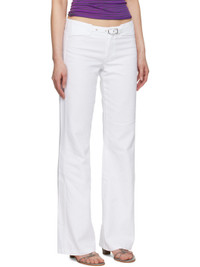 Flared non-stretch denim trousers. · Mid-rise · Integrated pin-buckle strap at waistband · Zip fly · Silver-tone hardware Available exclusively at SSENSE. Supplier color: White 100% cotton. Made in Spain 251776F087011