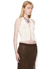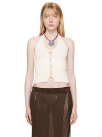 Stretch rib knit viscose tank top. · V-neck · Button closure · Self-tie halter strap Supplier color: White 50% viscose, 50% elastane. Made in Spain 241776F111015