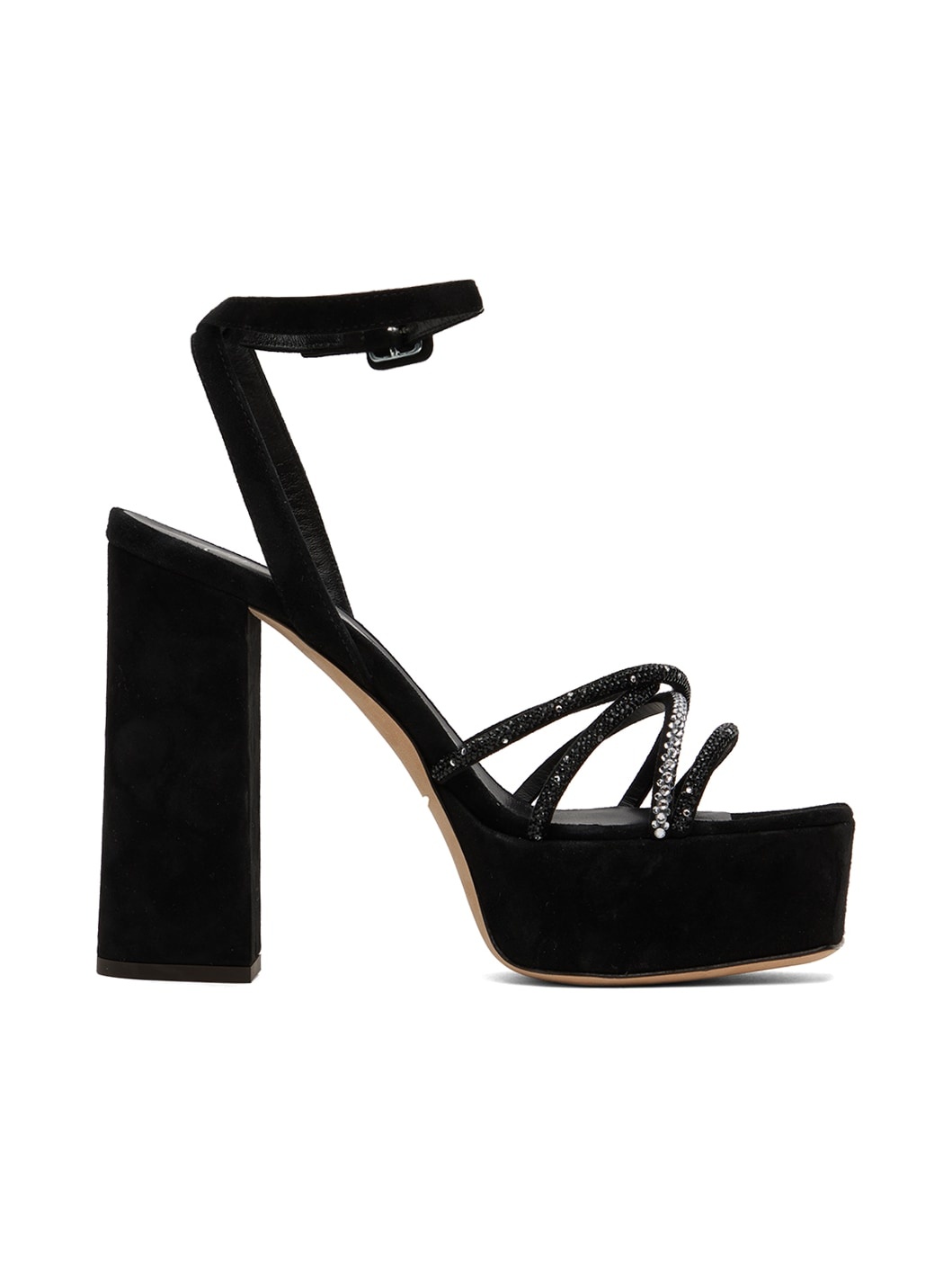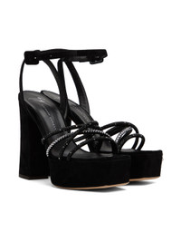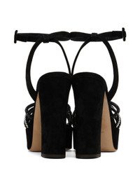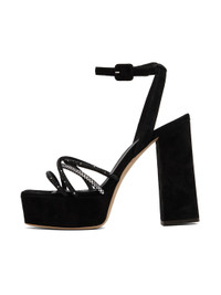 Suede heeled sandals in black. · Open square toe · Crystal-cut detailing at vamp · Adjustable ankle strap with pin-buckle fastening · Logo stamped at footbed · Covered block heel · Leather sole · Heel: 4.75 in Supplier color: Black Leather. Made in Italy 222266F125014